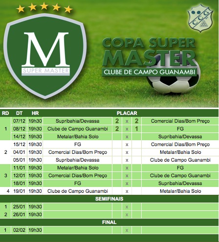 Nesta quinta(08) aconteceu a abertura da terceira edição da Copa Super Master do Clube de Campo Guanambi, a equipe da Supribahia/Devassa empatou em 2 x 2 com a Comercial Dias/Bom Preço, já na sexta(9) foi a vez dos donos da casa Clube de Campo vencer por 2 X 1 a forte equipe da FG(Faculdade Guanambi). As próximas rodadas acontece na quinta(14), onde a Supribahia recebe a Metalar e na sexta(15) Comercial Dias encara a F.G( Faculdade Guanambi), os jogos acontece nas dependências do Clube de Campo Guanambi sempre as 19:30hs..