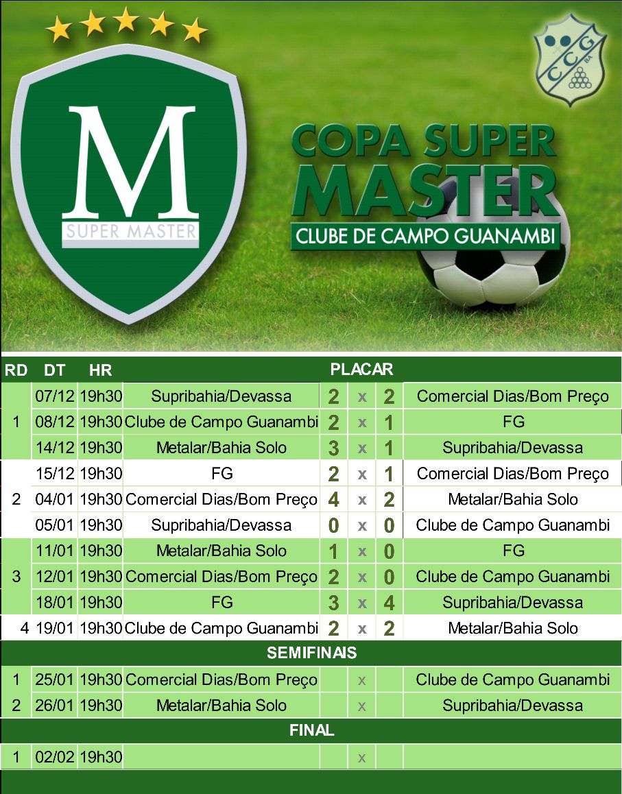 IMG-20180120-WA0173 IMG-20180120-WA0175A equipe da FG (Faculdade Guanambi) acabou sendo derrotada na quinta(18) pela a equipe da Supribahia por  4×3, com este resultado a FG deu adeus ao sonho de conquistar seu primeiro titulo da copa super master no Clube de Campo Guanambi, A equipe lutou muito, tinha ate a vantagem de jogar pelo empate ,mais numa noite feliz do atacante Paulo Renato da Supribahia, acabou fazendo um golaço no finalzinho do jogo, dando números finais ao jogão de bola:  Final 4×3 para a Supribahia , este resultados acabou sendo crucial para a eliminação dos “Galáticos da FG”,  A vitória colocou a Supribahia entre os quatro que farão a semi final da super master. Comercial Dias e Metalar  com 7 pontos, Supribahia e Clube de Campo com 5 pontos, farão as semi finais da copa super master de 2017/2018 do Clube de Campo Guanambi. Os jogos estão marcados para quinta(25) Comercial Dias x Clube de Campo as 19:30hs, e na sexta Metalar x Supribahia.no mesmo horário, os dois vencedores dos confrontos decidirão o titulo da 3° copa super master  na sexta(02-02) as 19:30h.