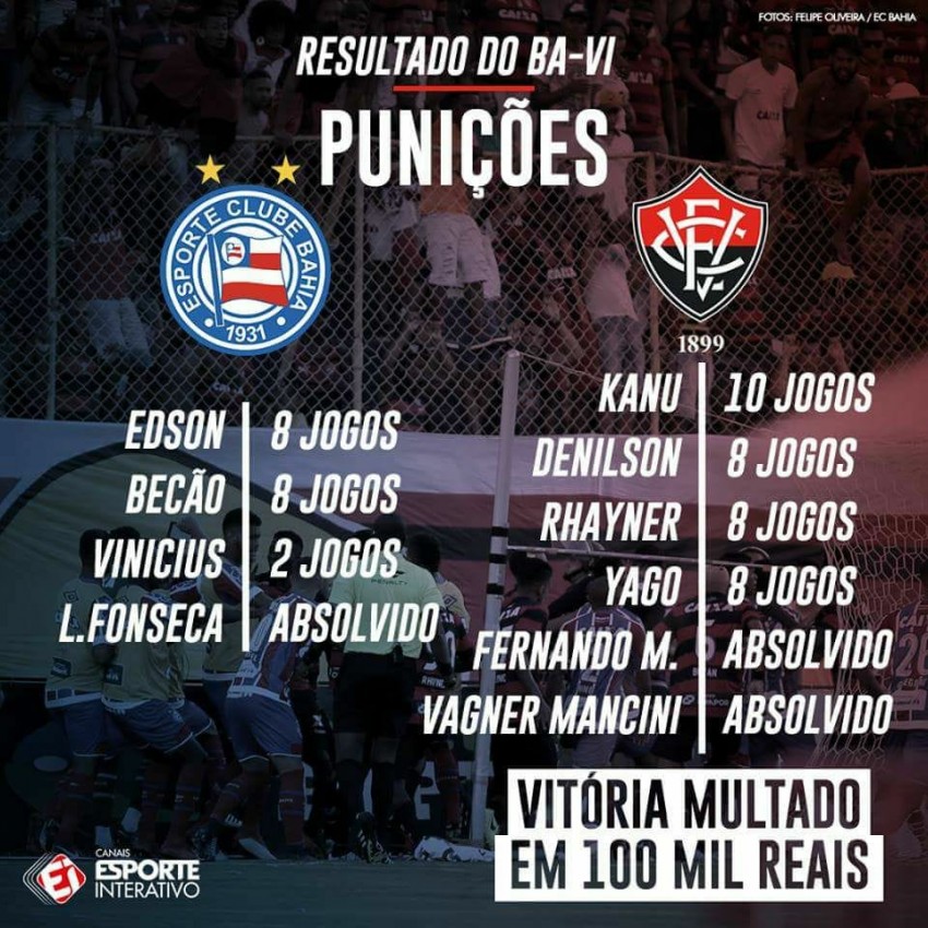 Os atletas de Bahia e Vitória, envolvidos da briga generalizada ocorrida no clássico Ba-Vi, do último dia 18, foram julgados nesta terça-feira (27), na sede do Tribunal de Justiça Desportiva da Bahia (TJD-BA), em Salvador. A sessão durou mais de quatro horas. Pelo lado do Vitória, o zagueiro Kanu foi condenado, pela maioria do tribunal, por agressão e está suspenso por 10 jogos, já pela denúncia de ameaça, ele foi absolvido, por 2 votos a 1. Por unanimidade, o meio-campista Yago, o meia-atacante Rhayner e o atacante Denílson foram condenados por agressão e não jogarão por oito partidas. No lado do Bahia, o volante Edson foi condenado, por 3 a 1, pela denúncia de agressão e ficará suspenso por oito jogos. Por unanimidade o zagueiro Rodrigo Becão também ficará oito partidas sem jogar, por agressão. O meio-campista Vinícius foi denunciado por comemorar com gestos obscenos e, por 3 votos a 1, foi condenado. Eles estão suspenso por duas partidas. O zagueiro do Bahia, Lucas Fonseca, foi absolvido, por unanimidade da acusação por ato hostil. Também foi absolvido, o goleiro do Vitória Fernando Miguel. Outros jogadores do Leão, os zagueiros Ramon e Bruno Bispo e o atacante André Lima, denunciados por ferir a ética disciplinar e por suspender o jogo, foram absolvidos. Sendo que Bispo recebeu três votos a favor da absolvição, enquanto a decisão para os outros dois foi unânime. O clássico Ba-Vi se transformou numa briga durante a comemoração do gol de empate marcado pelo meia Vinícius, do Bahia. Os rubro-negros Kanu, Yago, Rahyner e Denílson entraram em confronto com o atleta do Tricolor, que teve o reforço dos reservas Rodrigo Becão e Edson. Os seis jogadores acabaram expulsos da partida. Em seguida, Lucas Fonseca também foi posto para fora de campo. Reiniciada a partida, o volante Uillian Correia recebeu o cartão amarelo ao cometer uma falta de jogo. Depois, foi a vez de Bruno Bispo também ser advertido pela segunda vez e acabar expulso. Com número insuficiente de atletas pelo lado do Vitória, o árbitro Jailson Macedo Freitas encerrou o jogo com 35 minutos do segundo tempo. A decisão do TJD-BA, desta terça-feira, ainda cabe recurso na segunda instância. Por Bahia Noticias.